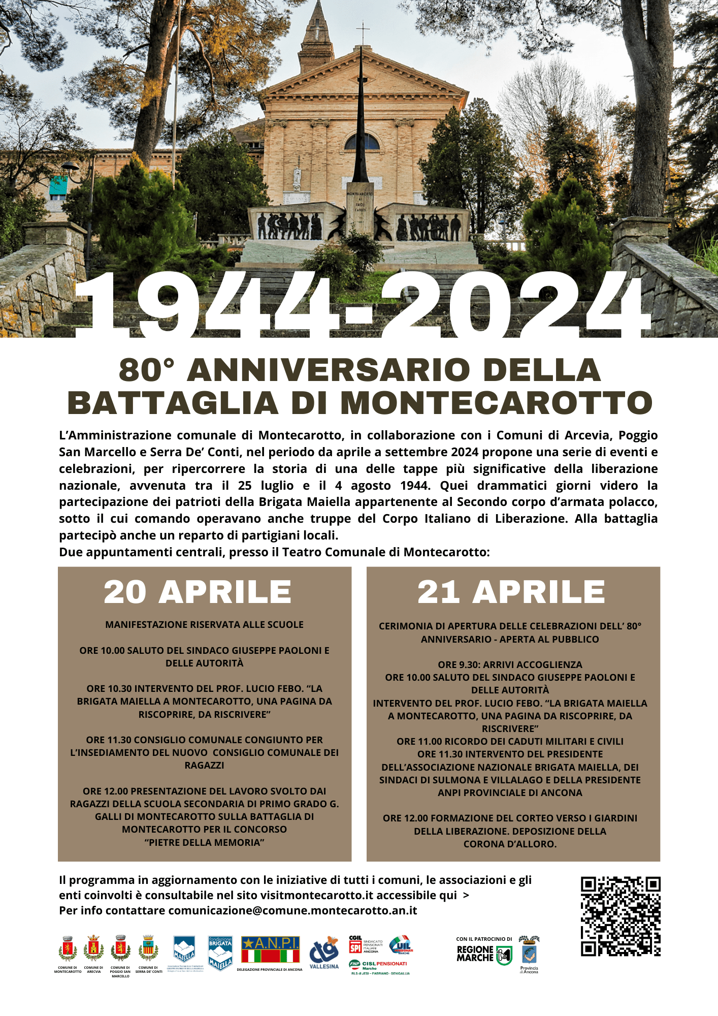 Il programma completo delle iniziative nei vari Comuni è costantemente aggiornato e consultabile qui: https://www.visitmontecarotto.it/1944-2024-80-anniversario-della-battaglia-di-montecarotto/