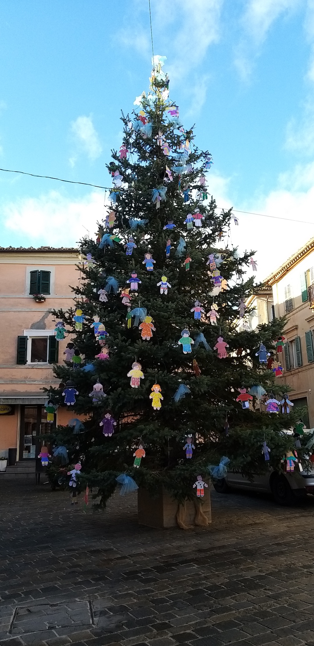 All'uscita, un enorme albero natalizio, addobbato con le pigotte realizzate dagli alunni di tutte le scuole di Montecarotto, ha salutato gli intervenuti.