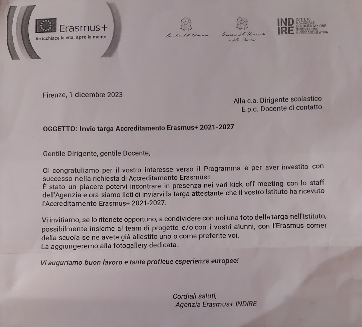 Pubblichiamo la targa di Accreditamento ricevuta dal nostro Istituto con le congratulazioni dell'Agenzia nazionale Indire.