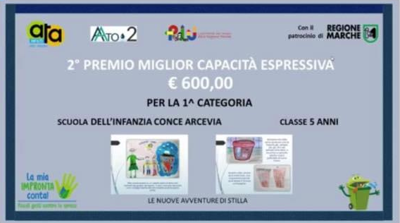 La scuola dell'infanzia di Arcevia è risultata vincitrice del secondo premio come migliore capacità espressiva al concorso “La mia impronta conta” indetto dal consorzio ATA rifiuti.