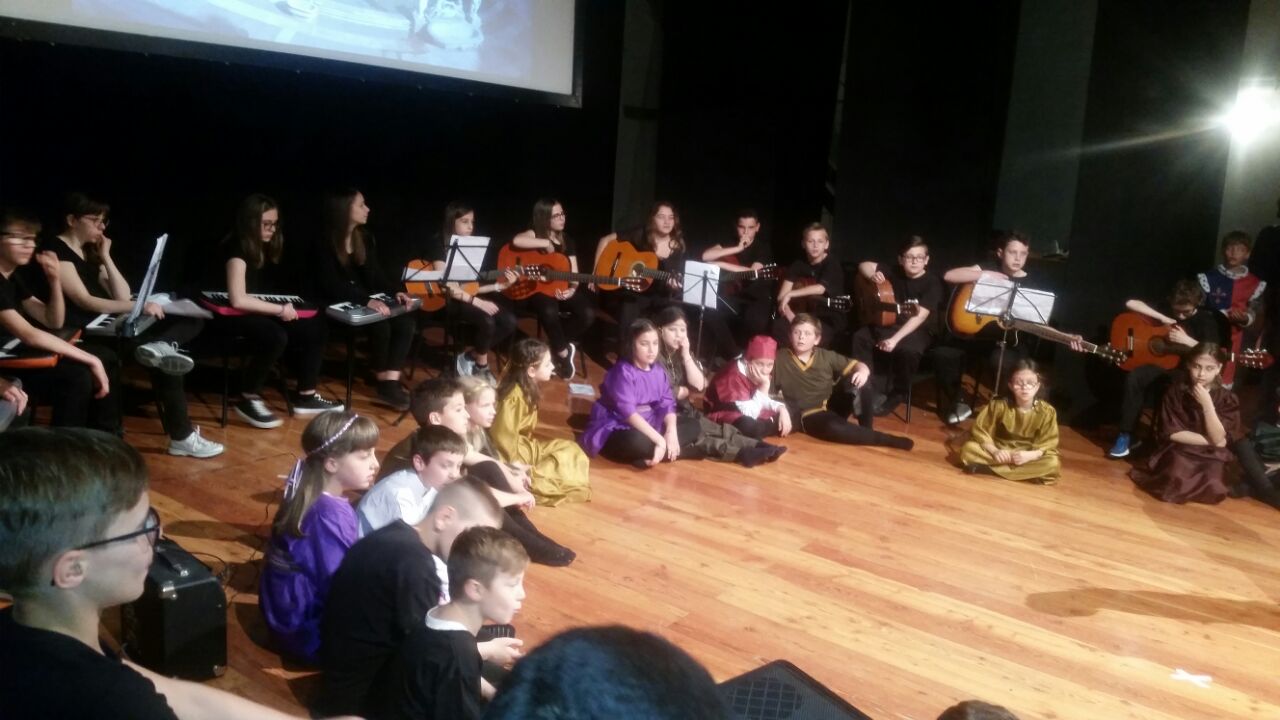 Il copione è stato scritto interamente dagli alunni della scuola primaria. Gli alunni della scuola secondaria hanno suonato vari strumenti per accompagnare i compagni più piccoli durante la recita in costume.