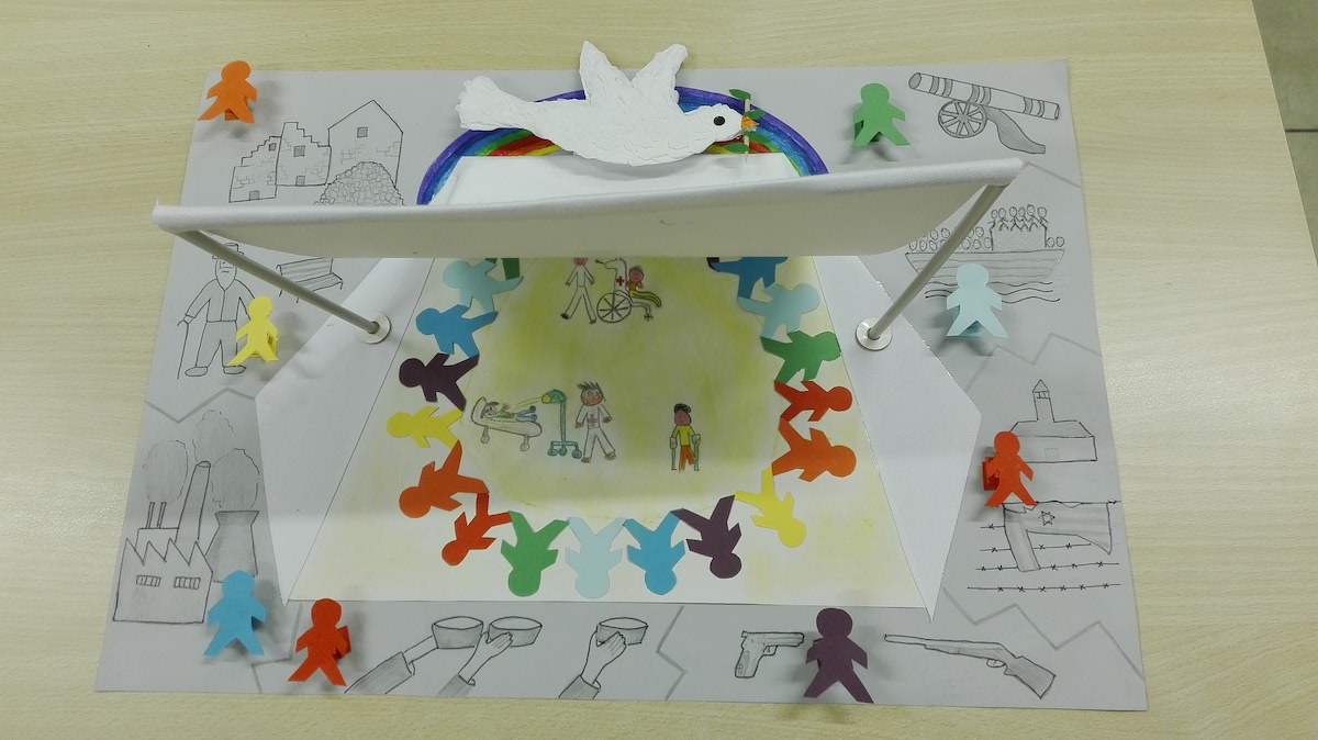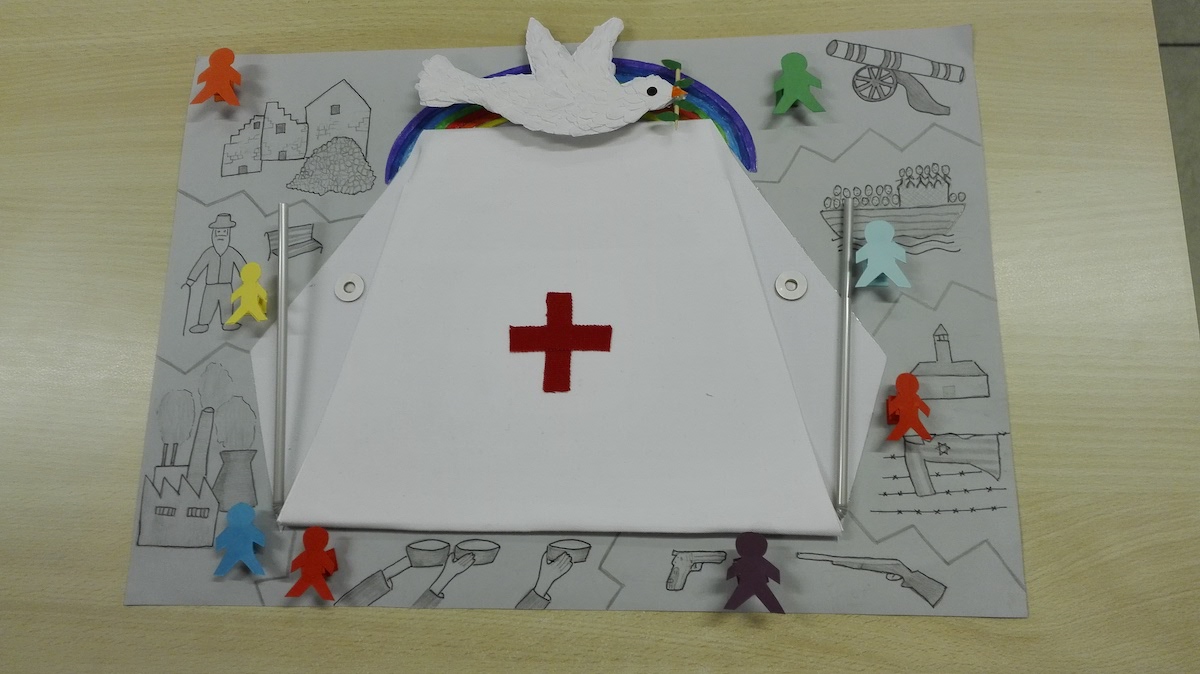 Infine gli alunni hanno realizzato l’elaborato da inviare al Consiglio Regionale, hanno riprodotto in bianco e nero varie situazioni di “non pace” presenti ora e nel passato nel mondo, in mezzo hanno realizzato in modo tridimensionale una tenda della Croce Rossa che si apre e all’interno della quale prevale il colore e la luce a rappresentare la pace portata dai volontari.