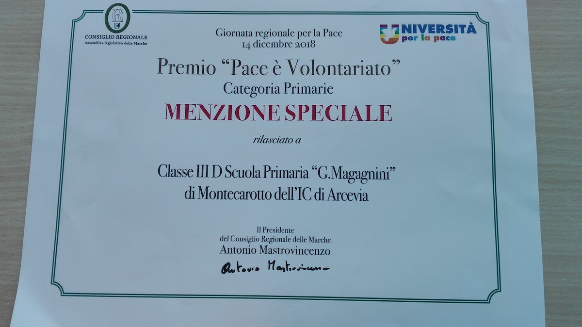 La classe III D della scuola primaria “Magagnini” di Montecarotto nei primi mesi dell’anno scolastico ha partecipato al concorso “Pace è Volontariato”, un progetto promosso dal Consiglio Regionale delle Marche in collaborazione con l’Ufficio Scolastico Regionale e l’Università per la Pace.