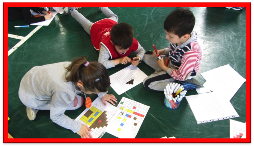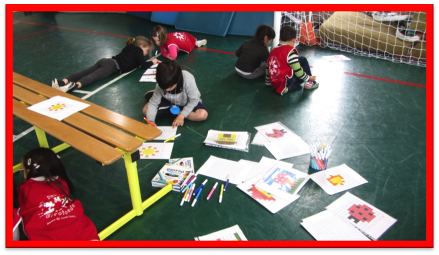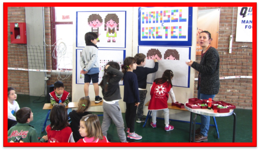 La giornata finale organizzata nella palestra è stata un’esperienza piacevole e divertente, sia per gli studenti che per i docenti che vi hanno partecipato. Gli alunni, suddivisi in gruppi misti e guidati da un insegnante di riferimento, hanno partecipato ad attività di coding unplugged: giochi psicomotori e percorsi di orientamento e lateralizzazione su tappeti quadrettati e su reticoli con frecce direzionali ed obiettivi mobili, mirati all’acquisizione dei concetti base del linguaggio di programmazione. Nelle diverse fasi dell’unità, è stata agevolata la didattica collaborativa. Lo sfondo integratore, che ha accompagnato le varie proposte iniziate in classe, è stata la fiaba di “Hansel e Gretel”. Come elaborato finale del progetto è stato invece realizzato un pannello in pixel art, con bicchieri di plastica e tovaglioli colorati, che rappresentava un elemento proprio della fiaba ed un reticolo colorato di tessere, raffigurante i due personaggi principali della storia. Ogni gruppo ha dimostrato grande spirito di collaborazione ed entusiasmo e cio’ per i docenti è stato sinonimo di successo della pratica educativa e didattica.
