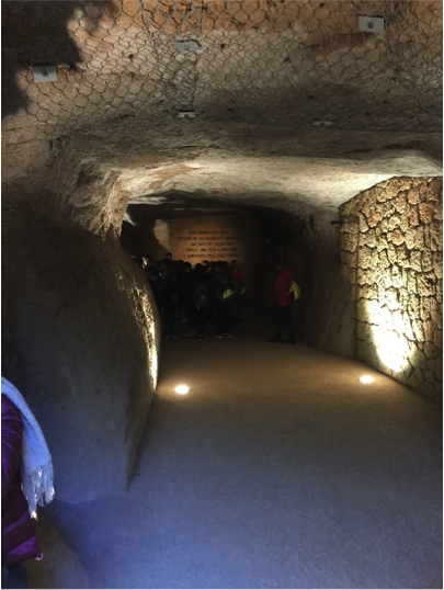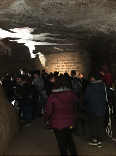 Dalla mattina del 24 marzo furono prelevate le vittime, scelte tra i detenuti politici e comuni di Regina Coeli e del carcere di via Tasso, i quali furono caricati e legati sui camion, per essere portati alle fosse Ardeatine. Cinque alla volta furono portati dentro la grotta e furono posizionati sopra ai corpi già morti per essere uccisi più velocemente; nella fretta di compiere la rappresaglia ne vennero uccisi 5 in più, fino ad arrivare a 335. I corpi delle vittime vennero identificati dopo la fine dell’occupazione tedesca su richiesta delle famiglie; sono stati identificati la maggior parte dei corpi, ma ancora oggi sono rimaste 11 persone ignote. Abbiamo ascoltato con estrema attenzione questa storia dalla voce della nipote di una delle vittime, un partigiano di nome Alfredo Sansolini. La guida ci ha condotto attraverso le strette vie della grotta bassa, buia e opprimente fino ad arrivare al luogo dell’eccidio, protetto da un cancello che rappresenta il groviglio dei corpi dietro ai quali riluce una candela a memoria delle persone sacrificate.