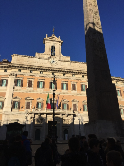 Nel pomeriggio siamo andati in visita alla camera dei Deputati: all’entrata ci aspettava una guida che ci ha indicato su una piantina le principali stanze che avremmo visitato. Passando per un corridoio ci siamo fermati di fronte alla sala della Transatlantico, dove abbiamo incontrato l’ex onorevole Marisa Abbondanzieri, che ci ha accompagnati per tutta la visita. Le stanze che abbiamo visitato sono: la sala della Lupa che prende il nome dalla presenza di una copia della lupa romana, il soffitto è arricchito da un grande affresco e contiene inoltre una delle poche copie della Costituzione e dell’ esito della votazione che ha portato alla proclamazione della Repubblica; la camera Gialla o sala Aldo Moro che prende il nome dalla tappezzeria e dai mobili in stile rococò provenienti dalla Reggia di Caserta. Continuando lungo il corridoio abbiamo visto la mostra che ricorda il centenario di Palazzo Montecitorio, progettato dall’architetto Ernesto Basile, contenente vari oggetti storici come progetti di sedie, scrivanie e in particolare il modellino in legno. Usciti ci siamo diretti verso la Camera dei Deputati dove la guida ci ha fatto sedere nei palchi in alto dove affacciandosi potevamo vedere i deputati che si stavano mettendo a lavoro per le votazioni.