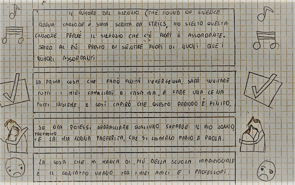 Dopo le prime settimane di lockdown ho pensato di far esprimere i ragazzi di 1C su questa esperienza imprevedibile, difficile da vivere e dal notevole impatto sulla loro naturale socialità.