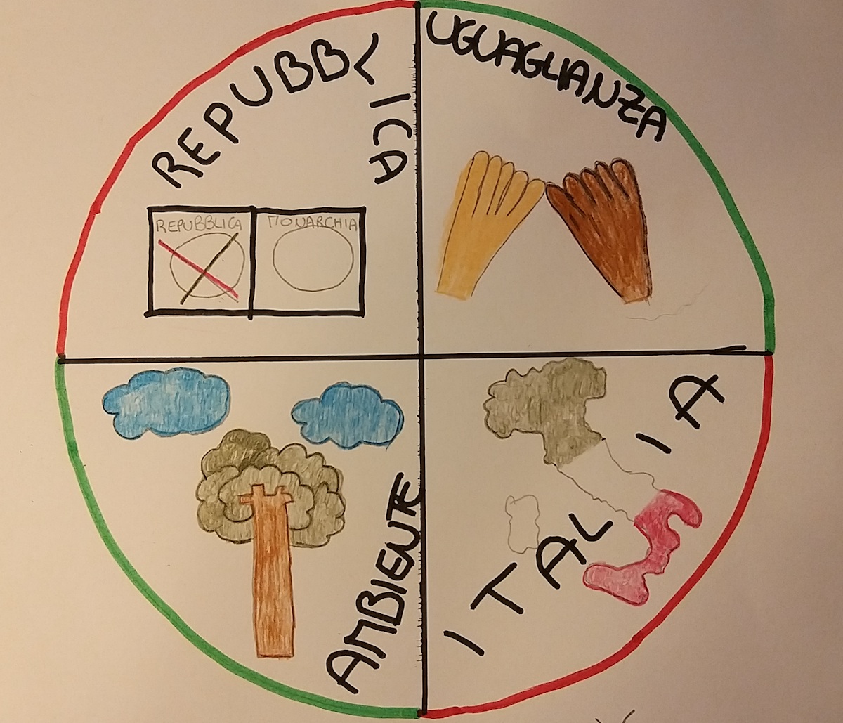 Il 4 Novembre, come ogni anno, il Consiglio Comunale dei Ragazzi avrebbe celebrato la fine della prima guerra mondiale al monumento ai caduti di Montecarotto. Questa volta però è stato impossibile farlo a causa del coronavirus. Abbiamo pensato di commemorare la ricorrenza pubblicando un lavoro prodotto durante le lezioni di educazione civica. Stiamo studiando la Costituzione, in particolare i suoi principi fondamentali contenuti nei primi dodici articoli. La professoressa ci ha proposto di inventare un nuovo simbolo per la Repubblica italiana: non solo lo "stellone" e il tricolore, ma anche quelli che abbiamo elaborato mettendo in azione la nostra creatività e sensibilità di giovani cittadini. Questo è il risultato. In molti dei nostri simboli sono presenti la convivenza pacifica, l'uguaglianza e il ripudio della guerra e delle armi, che sono stati il desiderio dei padri costituenti dopo due tragiche guerre mondiali. Un bel modo per celebrare ugualmente il 4 novembre.