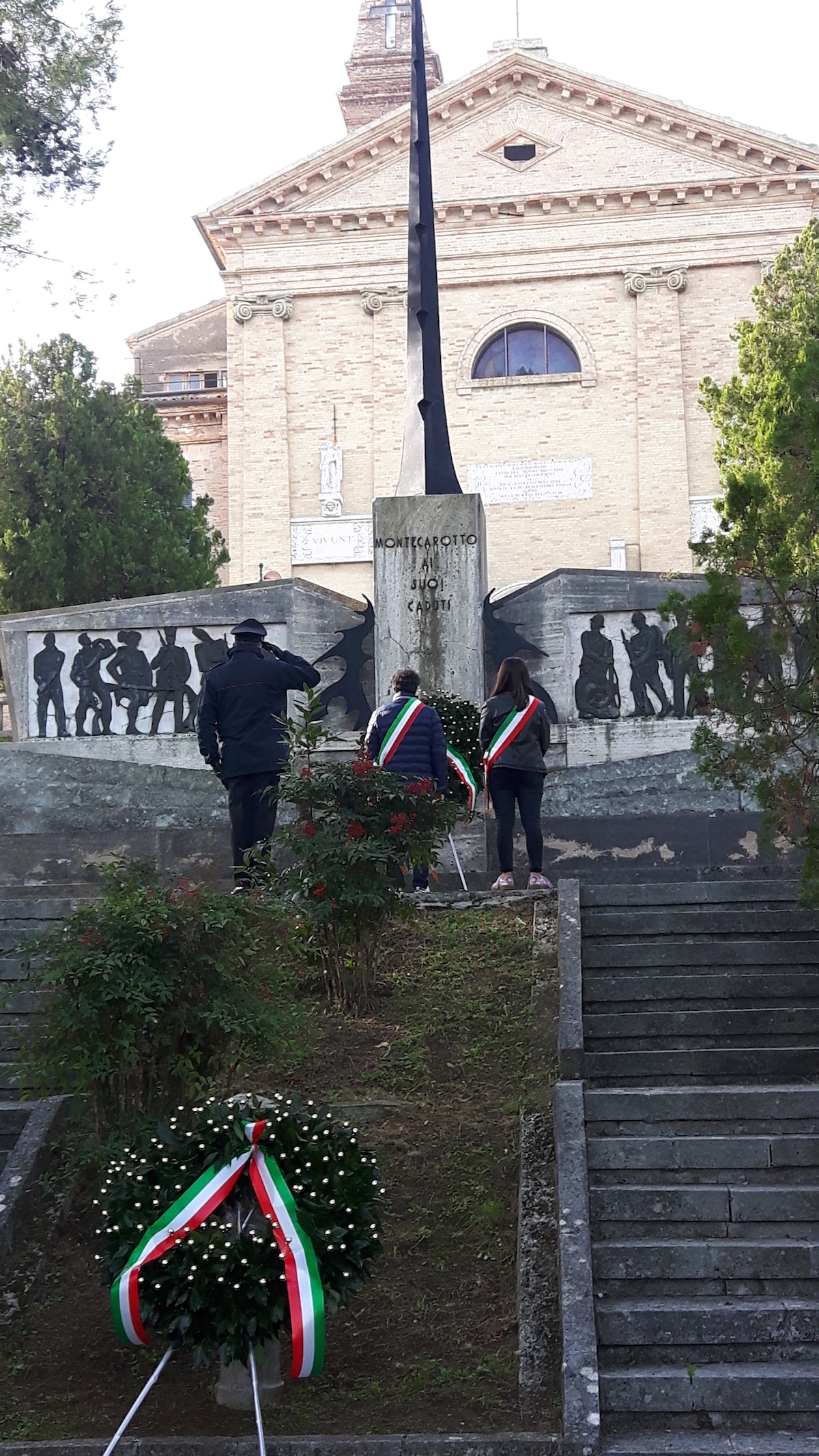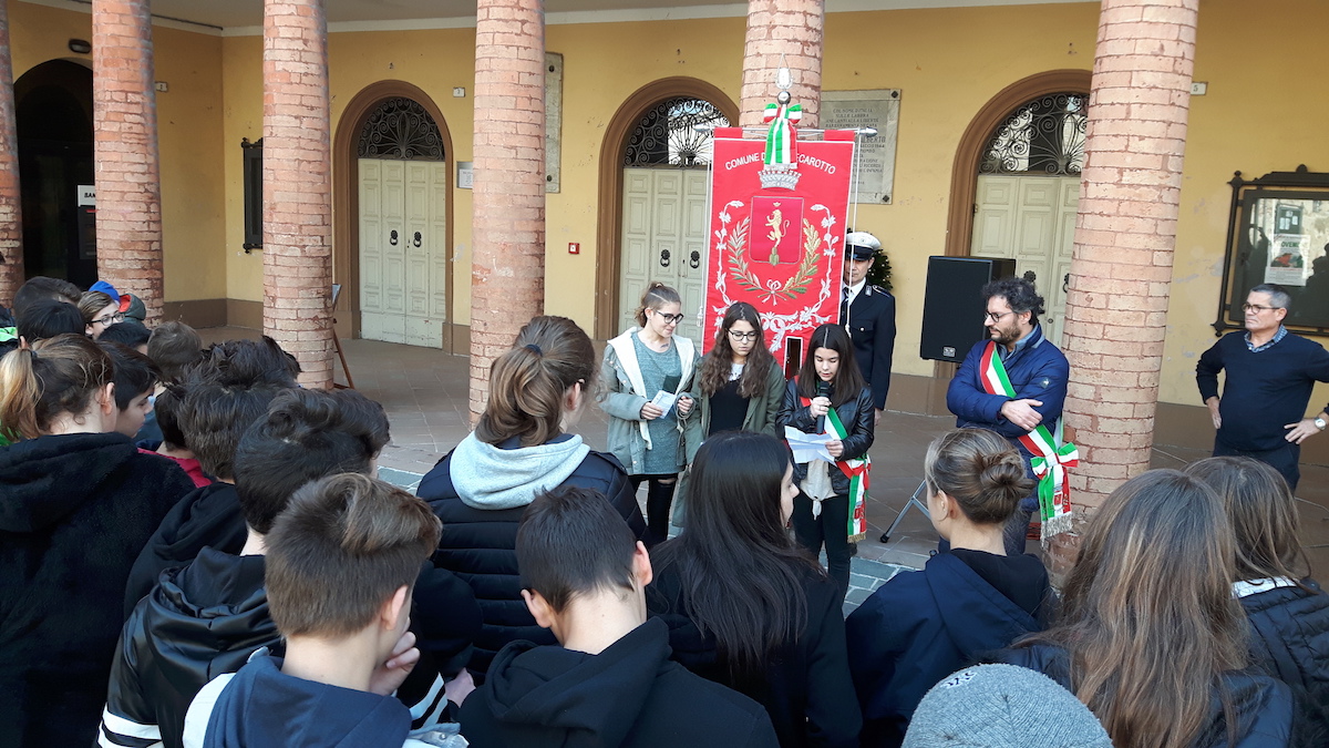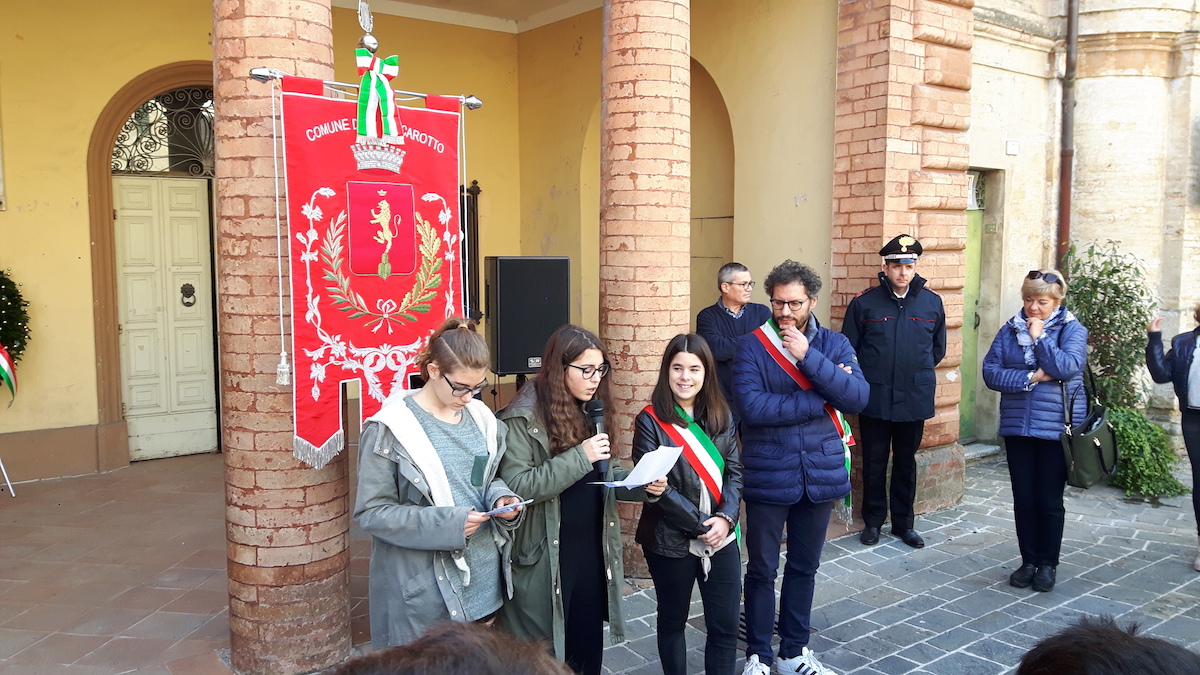 Dopo un sentito intervento del mini sindaco Linda Bartoli e di alcuni consiglieri del Consiglio comunale dei ragazzi, alla presenza del sindaco Mirco Brega e delle autorità civili e militari, gli studenti si sono recati nella chiesa parrocchiale dove lo stesso sindaco Brega, di fronte alle due lapidi che li commemorano, ha ricordato ai ragazzi quanti montecarottesi sono morti nei due conflitti del '900.