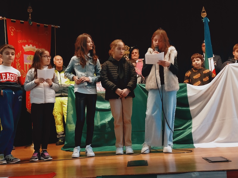 Alla cerimonia, oltre al sindaco, le autorità civili, militari e le associazioni combattenti, hanno preso parte gli alunni delle classi Quinte e Quarte della scuola Primaria G. Leopardi di Serra de’ Conti. Dopo il breve discorso del sindaco Letizia Perticaroli, che ha ricordato quanto la guerra sia ancora oggi una triste realtà per molti popoli e quanto sia importante tutelare e preservare la pace e la democrazia, alcuni alunni di classe quinta hanno letto un brano tratto da “La notte in cui la guerra si fermò” di James Riordan e “La leggenda del Piave”.