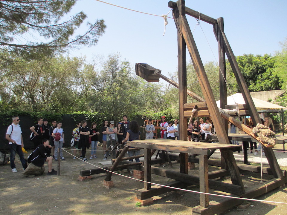 La guida ci conduce in seguito in un’altra sezione del parco: quella dedicata alle macchine belliche ideate dallo scienziato. Già, perché lui aveva utilizzato il suo ingegno anche per difendere la sua città che, nel III° sec. a.C., venne attaccata dai Romani. Ovviamente l’opinione pubblica era per la schiacciante vittoria di Roma, che in effetti avvenne, ma non fu poi così schiacciante, perché i suoi soldati dovettero assediare la città per ben due anni prima di espugnarla, tenuti in scacco da Archimede.