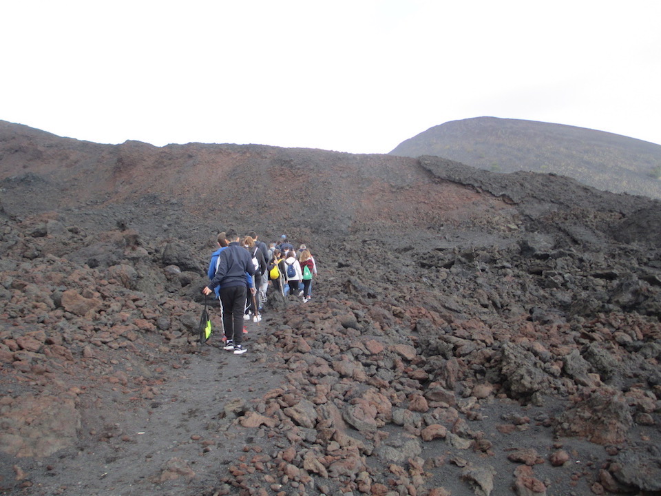 Dopo aver mangiato, ci prepariamo e saliamo sul pullman che ci porta a quota 1800 metri s.l.m., in prossimità del luogo da cui partiamo per fare la nostra escursione sull’Etna. Prima di incamminarci, la nostra guida ci illustra la storia del famosissimo vulcano siciliano, con particolare attenzione per la sua eruzione del tutto improvvisa nel 2002 che, per mezzo delle sue colate laviche ha devastato tutto il versante nord-est (la zona in cui ci troviamo), sommergendo hotel, alberghi, impianti di risalita e gran parte della vegetazione. Il risultato è stato un terreno brullo, fatto di ciottoli e macerie misti a rocce eruttate dal vulcano, un terreno che impiegherà dei secoli per essere di nuovo ricoperto di verde.